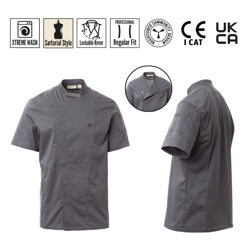 Innovativa giacca da cuoco con collo alla coreana, realizzata in ripstop di cotone e Lycra® T400®, con ottime proprietà elastiche e traspiranti.