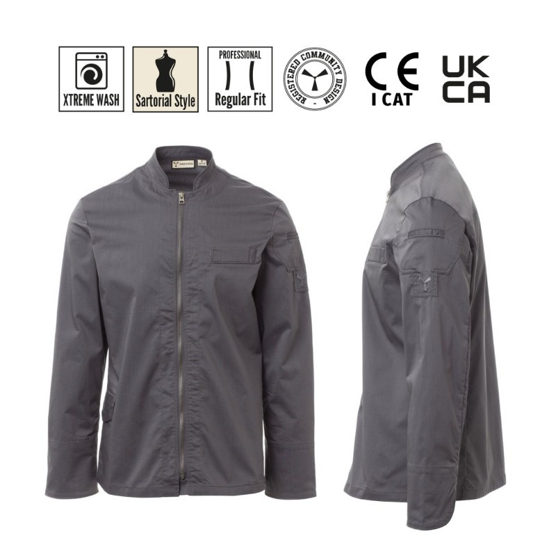 Chiusura centrale con zip. Manica lunga con polsino risvoltabile, lunetta in tessuto a rete nel sotto giromanica, per agevolare la traspirazione. Iconica toppa sagomata sulla spalla sinistra, con ricamo ad elica tono su tono, provvista di taschino porta penne. Taschino al petto e pratica tasca porta smartphone in vita, chiusa con patta. Profili in tinta su collo, polsini e taschini.